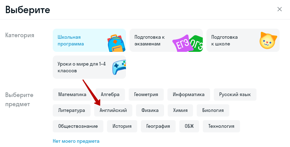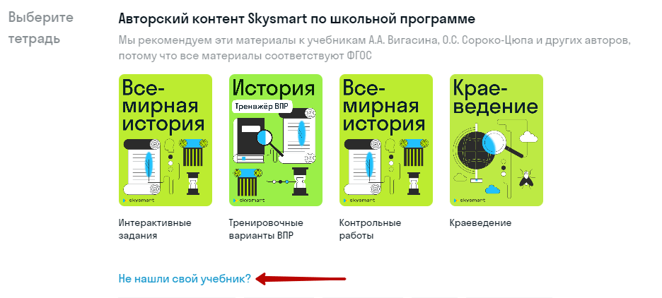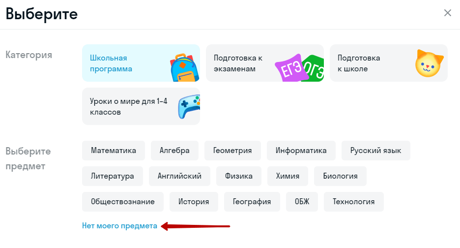- нажмите на одну из кнопок: Нет моего предмета / Не нашли свой учебник? ;