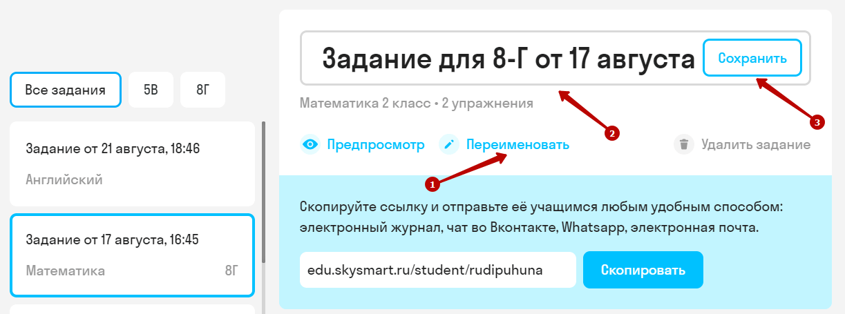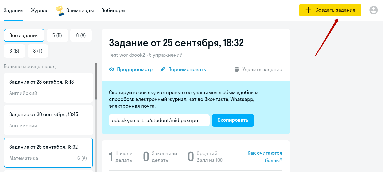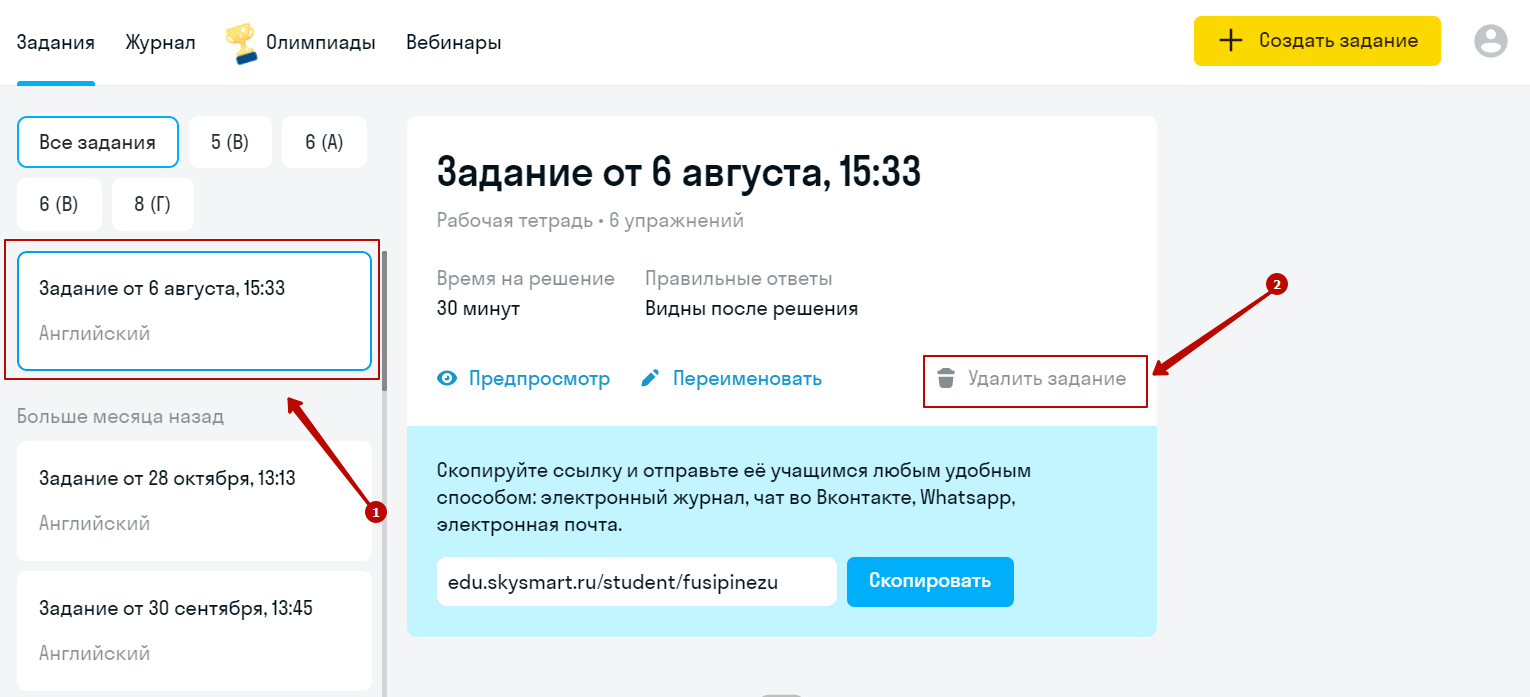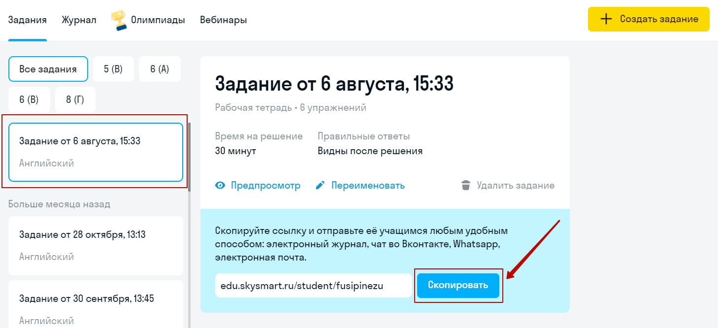 6. Система сгенерировала ссылку для учеников. Скопируйте ссылку на задание и отправьте классу любым удобным для вас способом.