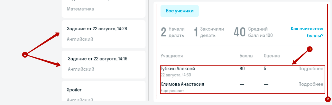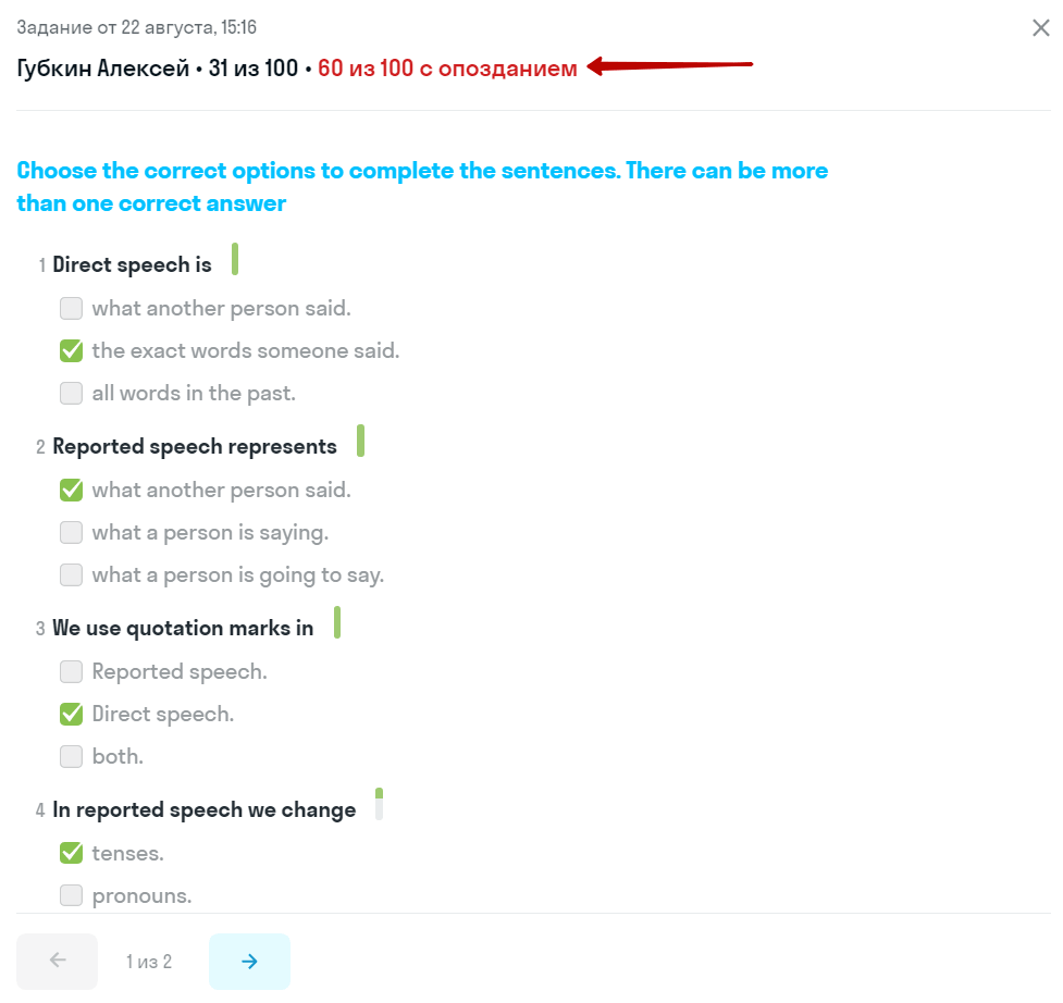 - Если ученик выполнил задание по истечению таймера, вы увидите соответствующую пометку "с опозданием" в статистике. У такого ученика будет 2 результата - за упражнения, которые он успел выполнить до истечения таймера, и общий балл за выполненное задание без учета длительности выполнения. Нажмите Подробнее , чтобы увидеть эти различия.