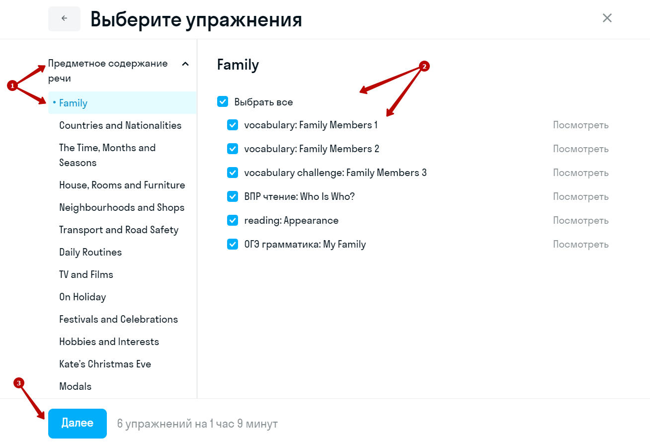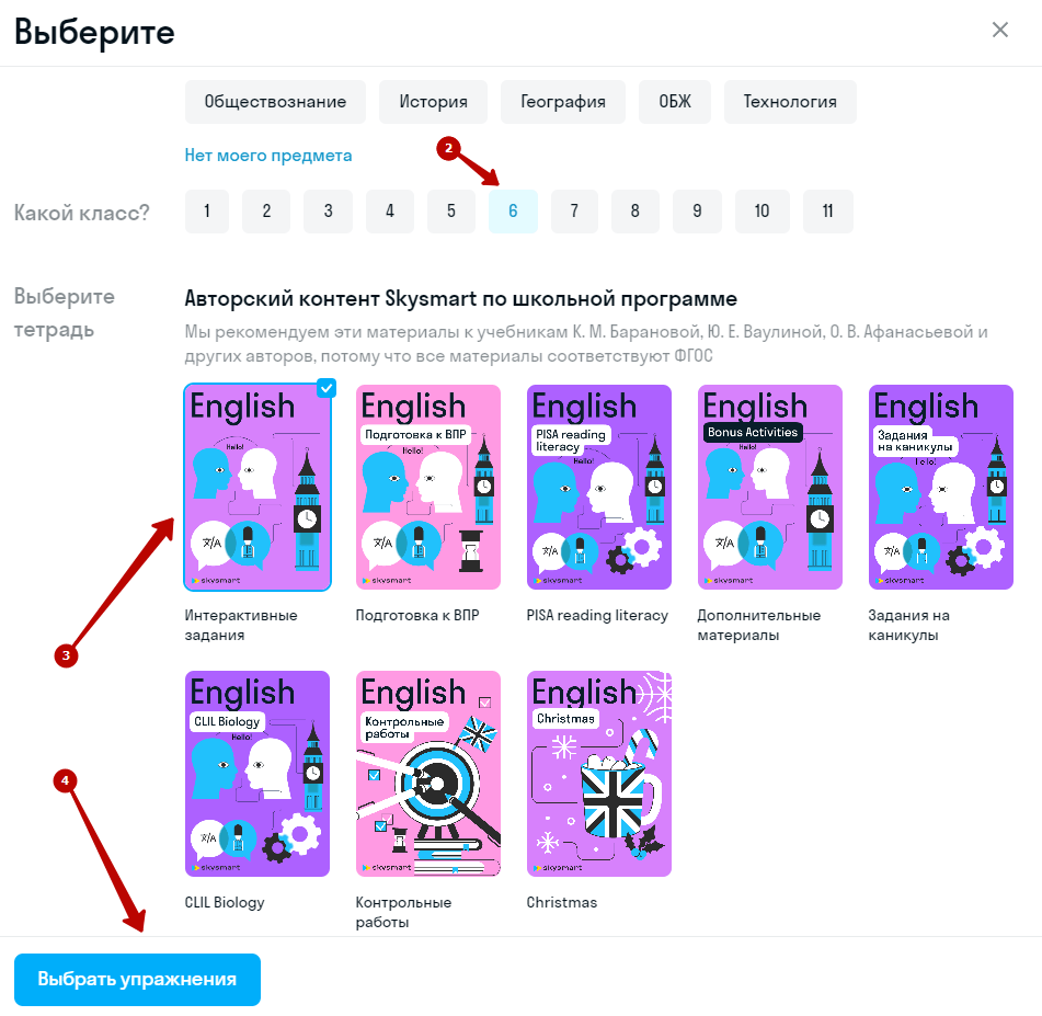 - Подтвердите выбор, нажав на кнопку Выбрать упражнения (4).